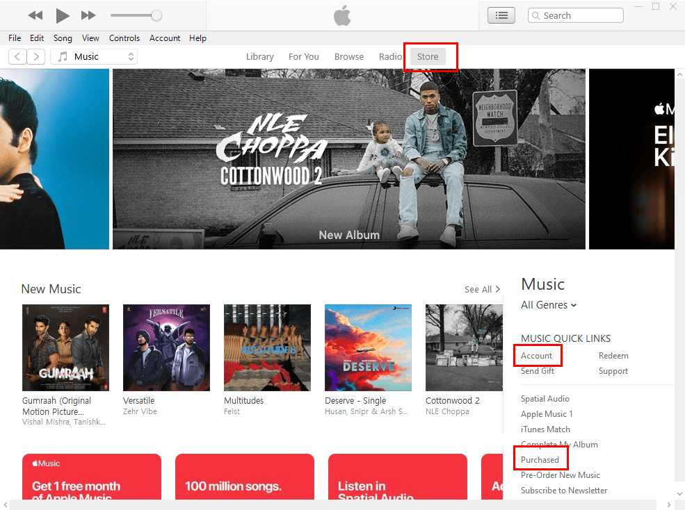 På en Windows 11 eller 10 PC eller macOS Mojave eller tidligere enhed, skal du installere iTunes appen for at få adgang til købte indhold fra Apple iTunes. Du skal også logge ind på iTunes med den rette Apple ID, som du købte musik, tv-shows, bøger osv. med. Når du logger ind med den rette Apple ID til iTunes, skal du følge disse trin:
