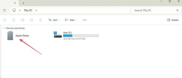Συνδέστε την άκρη “Lightning” του καλωδίου φόρτισης iOS στη συσκευή Apple και την άκρη USB στον υπολογιστή. Τώρα κάντε κλικ στο “Έναρξη” στον υπολογιστή Windows και μεταβείτε στο “Εξερευνητής Αρχείων.” Κάντε κλικ στο “Αυτός ο Υπολογιστής” στο αριστερό μενού και θα πρέπει να δείτε τη συσκευή Apple στα διαθέσιμα συστήματα και μονάδες σας. Αυτό το βήμα είναι καθαρά για να ελέγξετε αν η σύνδεση μεταξύ των δύο συσκευών είναι επιτυχής.