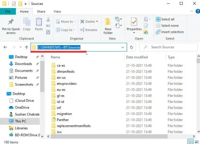 Ta korak ne klikne Naprej, ampak odpre Windows Explorer in dostopa do poti: C:\$WINDOWS.~BT\Sources\