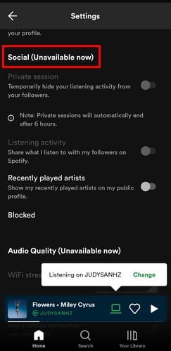 V socialnem razdelku boste našli možnost dejavnosti poslušanja, ki jo želite izklopiti. Glavno napravo za poslušanje lahko nastavite tako, da tapnete na možnost Trenutna naprava, ki izgleda kot majhen zvočnik. Izberite možnost Ta naprava, in vse možnosti v socialnem razdelku bodo zdaj dostopne.